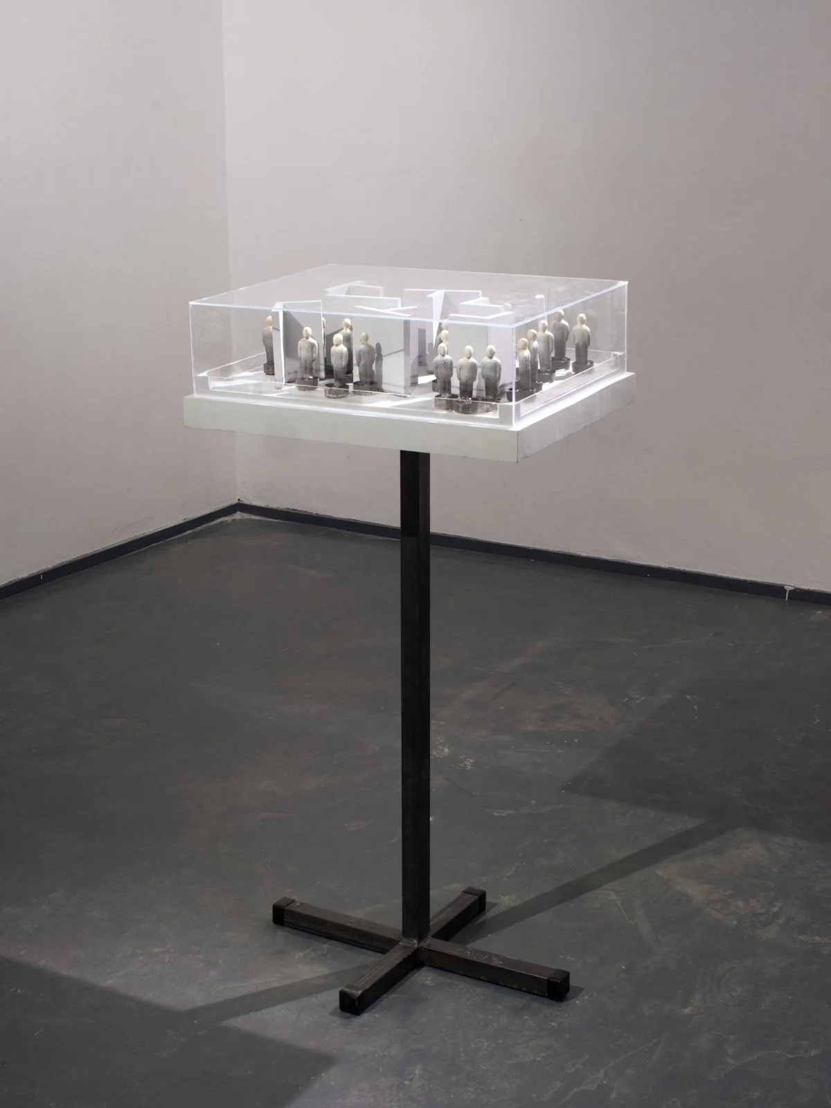 Busy Busy Busy’s micro-robotic inhabitants hustle and bustle through a set of rooms in a plexiglass enclosure. The viewer looms over, observing the little men running around the same way a scientist would lab rats. All of the men are cast from a mold, making each of them virtually identical, having no individuality other than different dents in their robotic structure. They are corralled by the space they inhabit, buzzing along walls and bumping into each other. They seem to be indifferent to each other, paying no more attention to each other unless stuck in the same crowd. Each time a crowd forms, it eventually clears after a few minutes of everyone struggling to move past each other. Each one of the little robot men continues on his own path.