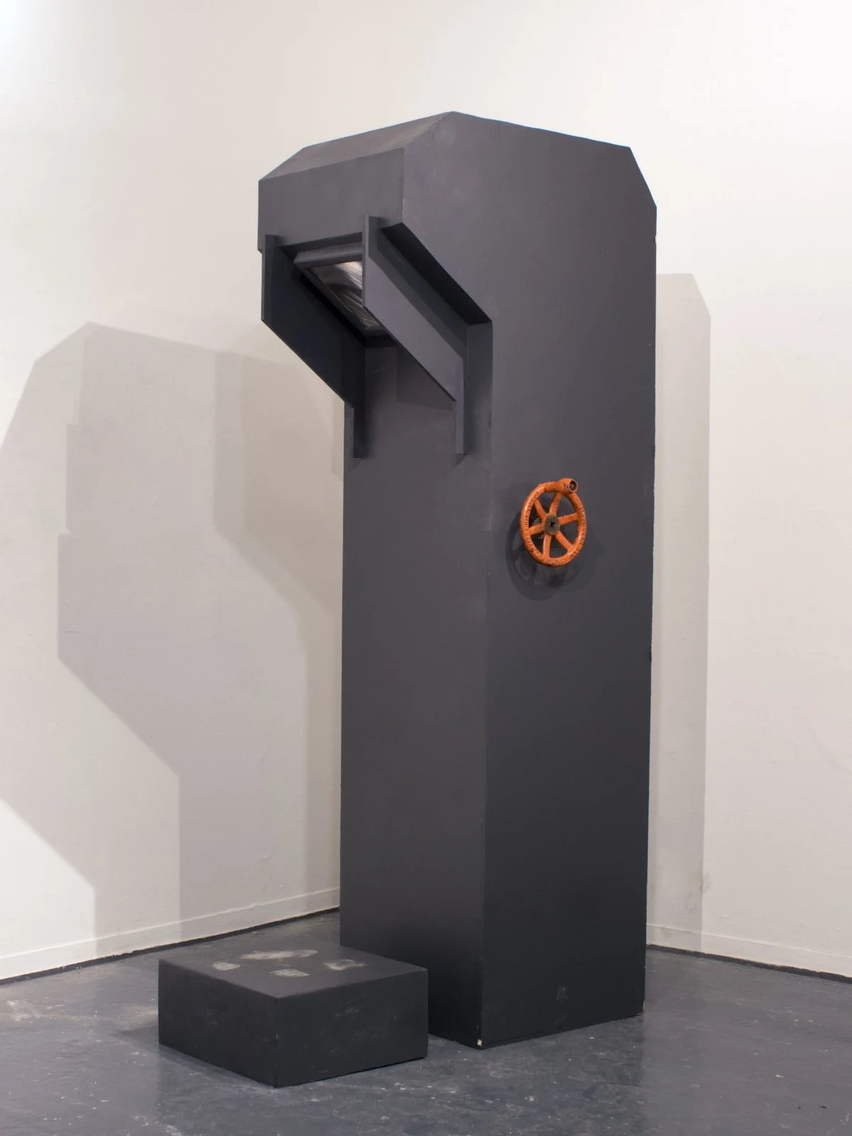 Compulsion Machine looms over the viewer as they walk up to it, with a step leading one to be eye level with a screen in between blinders. Behind this screen is a strip of text commanding the reader to turn the crank, submit their control, and continue reading. The crank makes the text move past the screen, continuing to scold, dissuade, and discourage the viewer, with intermittent reminders to continue reading, cranking, and submitting. Eventually, through enough obedience, the text wears down, allowing a separate voice to fade in, urging the reader to let go, to stop letting this machine tell them what to do. If they do step away, they can look around the back of the machine to see inside, and see a cobbled together mechanism held together with tape and hot glue, with a chain driving the belt past the screen. The text is a lot less powerful, and the machine a lot less authoritative, when the viewer is able to see how it works. It can only function when the viewer allows it to, giving power to its empty words.
