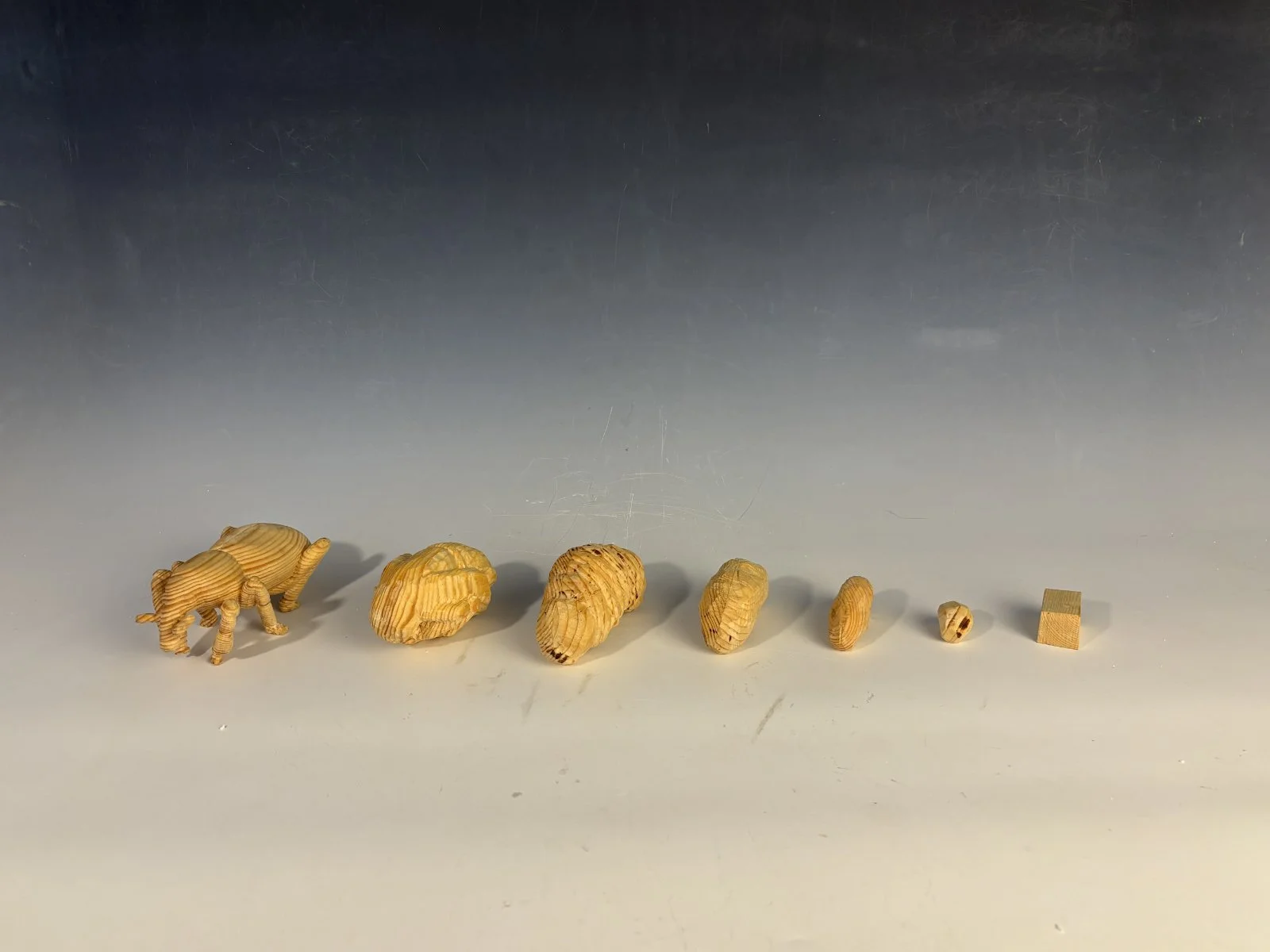 In this project, I wanted to examine my wood carving techniques and push my skills to their limits. In making each phase of the insect’s life another step closer to the finished project, I was able to analyze what choices and methods I use to achieve certain levels of detail, and with what speed I could change the wood into that form through each method. The first phase, the egg/uncarved form was made using the bandsaw. Then was the first instar, made on the disk sander. After this came roughing it out with an angle grinder, then further roughing it out with angle grinder, with some rough dremel carving done for the second to last larval stage. The grub, or final instar/larval stage was carved using a more patient and involved level of dremel carving. The pupa was done with small detailing bits, and the final, adult stage was created using hand carving knives and then sanded. Each of these individual pieces used the process or method of the ones before it, plus a new level of detail and technique. In this way, I was able to create a piece that examines the act of carving, and the steps it takes to bring a piece to completion, from raw wood to intricate form. The process felt tied to this piece as much as the forms themselves. Crafting the beetle’s life stages in this way insinuates the adult stage is the completion of the insect’s life cycle, which makes sense. Still though, I wonder how I could make this work feel more cyclical, because these insect life spans don’t end in adulthood. Eggs are laid, hatched, and then new larval insects emerge. The process repeats itself over and over again.